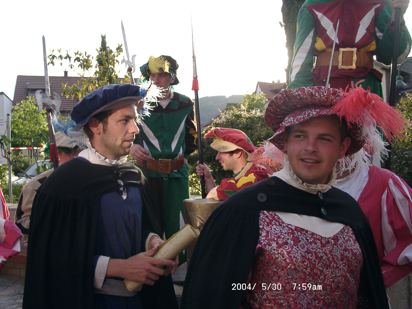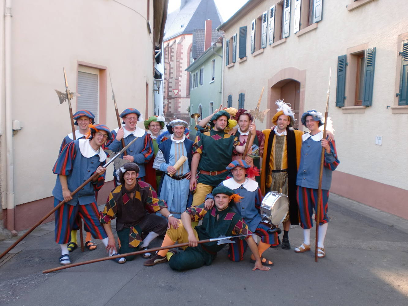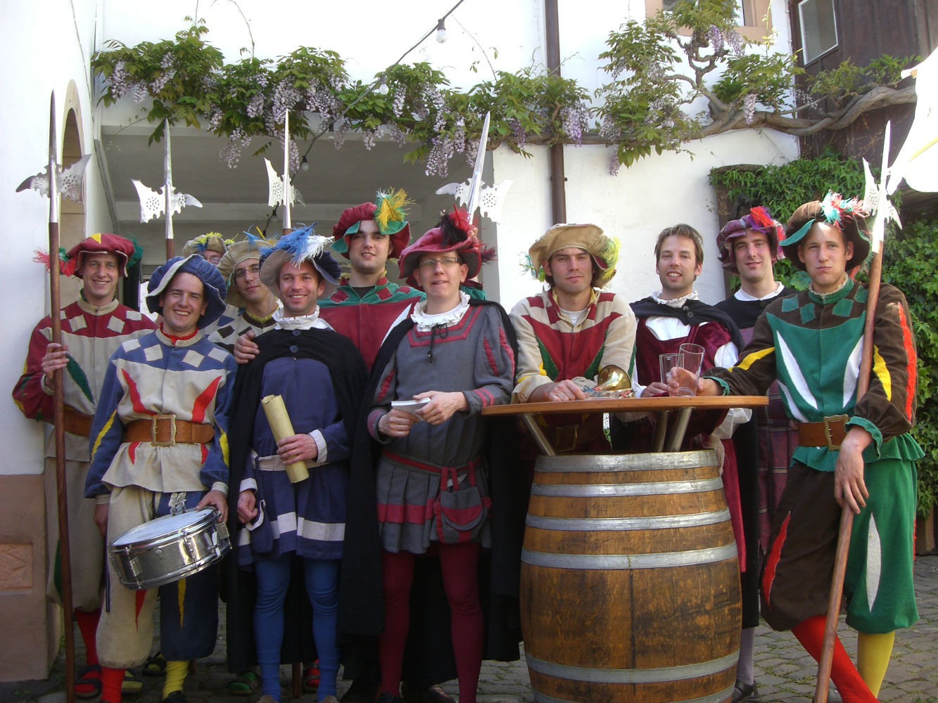 Am Pfingstsonntag ziehen wir Buwe durch die Gaststätten und Straußwirtschaften Deidesheims, um Einheimische und Fremde zur Geißbockversteigerung einzuladen, die am darauffolgenden Dienstag stattfindet. Dabei tragen wir historische Kostüme von Landsknechten, Stadtsoldaten und Abgesandten. Wegen der Vielzahl an gastronomischen Betrieben und Ausschankstellen bei der Pfingstkerwe in Deidesheim sind wir dabei einen ganzen Tag unterwegs. Folgende ist unsere Botschaft an diesem Tag: