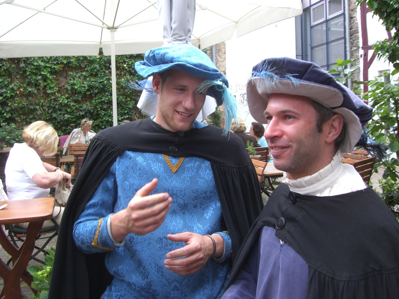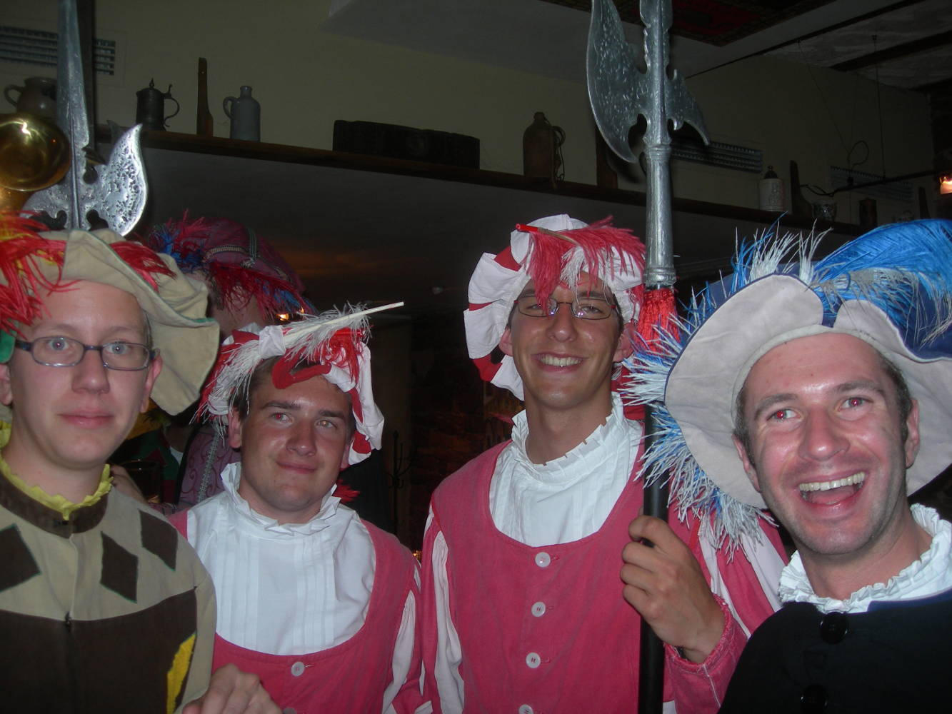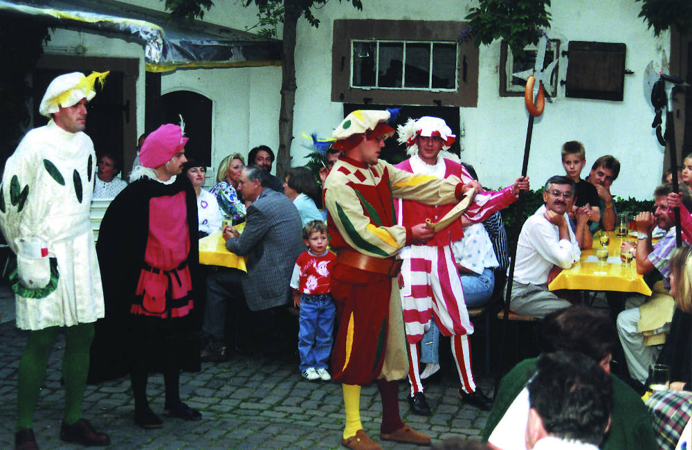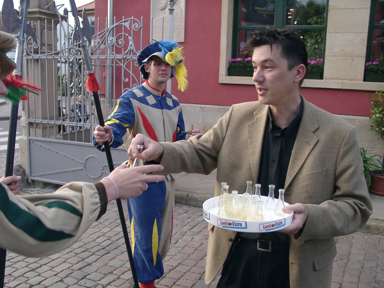Am Pfingstsonntag ziehen wir Buwe durch die Gaststätten und Straußwirtschaften Deidesheims, um Einheimische und Fremde zur Geißbockversteigerung einzuladen, die am darauffolgenden Dienstag stattfindet. Dabei tragen wir historische Kostüme von Landsknechten, Stadtsoldaten und Abgesandten. Wegen der Vielzahl an gastronomischen Betrieben und Ausschankstellen bei der Pfingstkerwe in Deidesheim sind wir dabei einen ganzen Tag unterwegs. Folgende ist unsere Botschaft an diesem Tag: