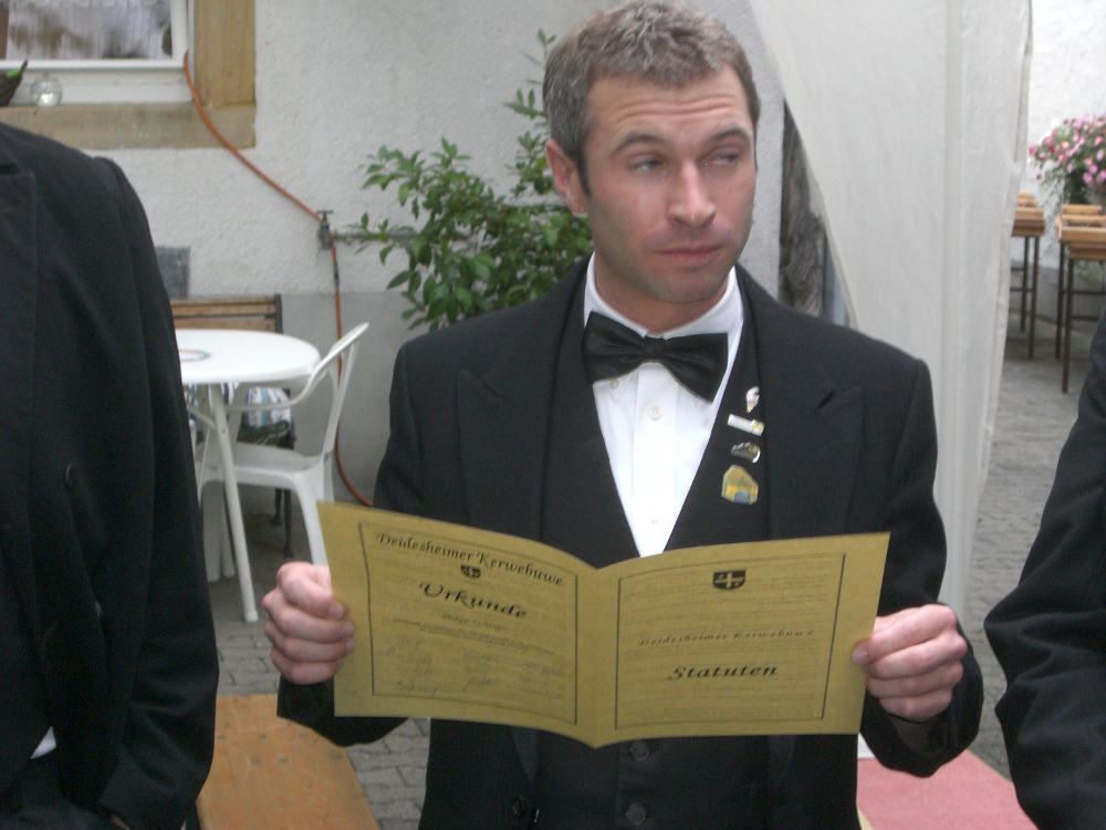 Die literarisch überlieferten Statuten der „Zunft junger Burschen zu Kriegsfeld“ aus dem Jahr 1787 dienten unseren Statuten als Vorbild. Bei uns werden sie jedem Kerwebu am Tag seiner Aufnahme vom Dienstältesten vorgelesen. Danach – siehe unten – wird dem Burschen das erste Mal zugetrunken, worauf der der betreffende das Glas bis auf den Stumpen zu leeren hat.